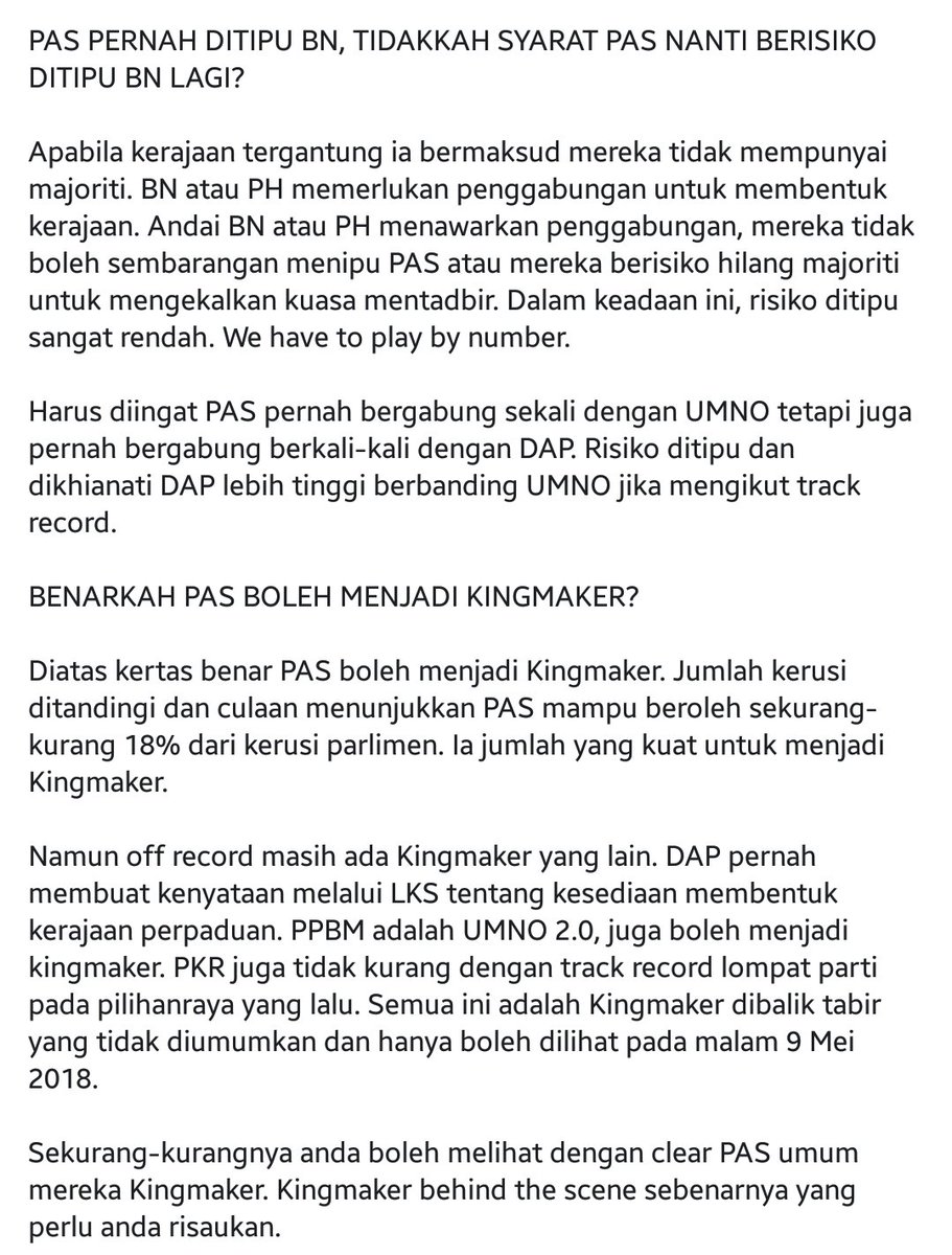 Pada Pilihan Raya Negeri PRN Melaka ia hanya mengharapkan pengundi Pas dan sebahagian pengundi Melayu yang berpuas hati dengan kerajaan PN diketuai oleh Tan Sri Muhyiddin Yassin. Kita memenangi Pilihan Raya Umum Ke-14 kerana kita bersatu dan mempunyai platform terbaik dan benar-benar memberi harapan kepada semua rakyat Malaysia. Ia memilih untuk bekerjasama dengan PAS tetapi parti Islam itu tidak kuat di Melaka.