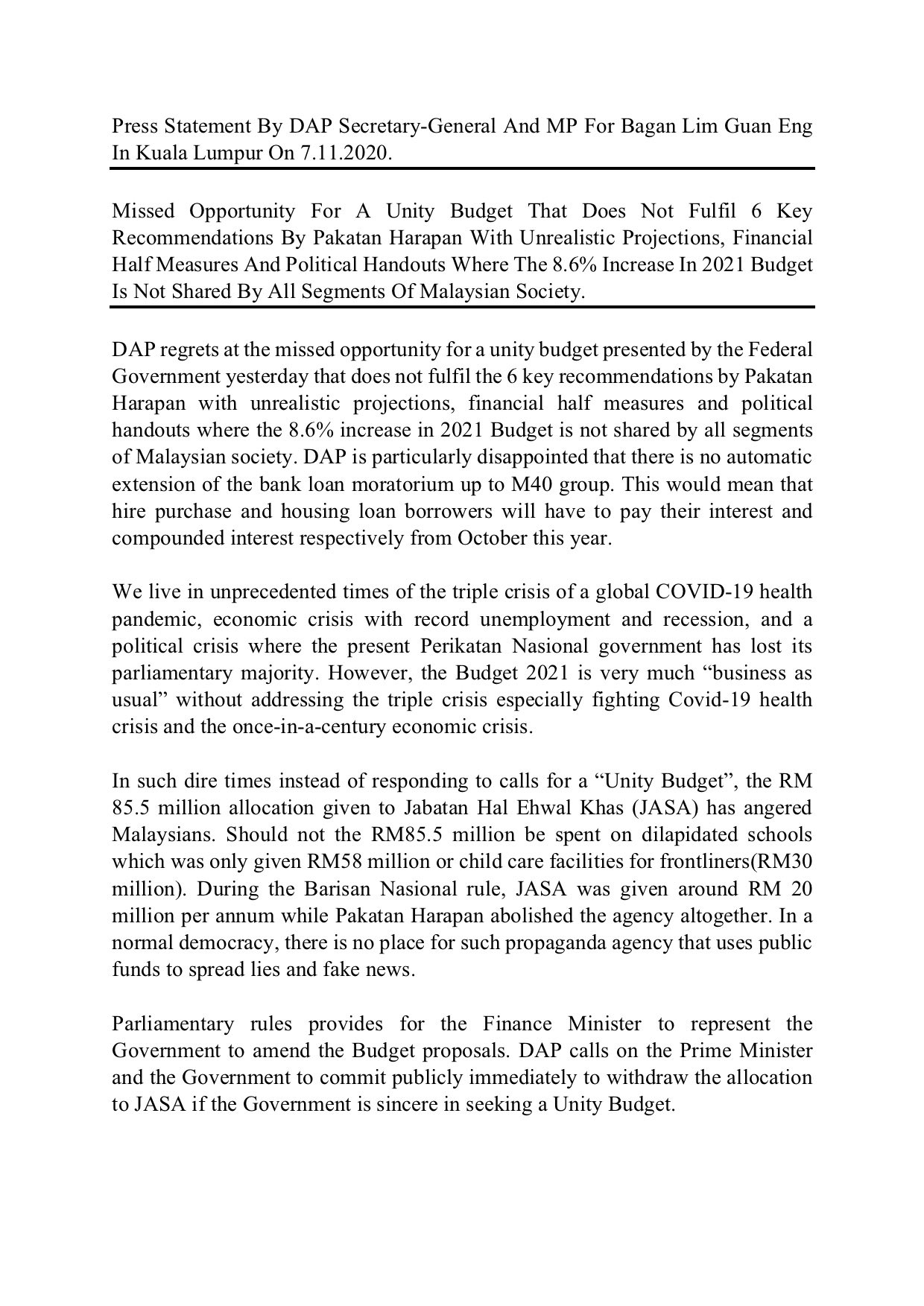 Pakatan Harapan proposes Unity Budget November 1 2020 857 pm Raggie Jessy Among the recommendations by Pakatan Harapan leaders were for increased health ministry resources to deal with Covid-19 and non-communicable diseases NCDs. But it is a budget that has. KOTA KINABALU Nov 15.