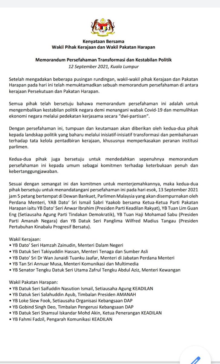 Elill On Twitter Just In Prime Minister Ismail Sabri Will Be Signing A Memorandum Of Understanding Mou Along With Pakatan Harapan Leaders Tomorrow Both Sides Agreed To Sign The Mou